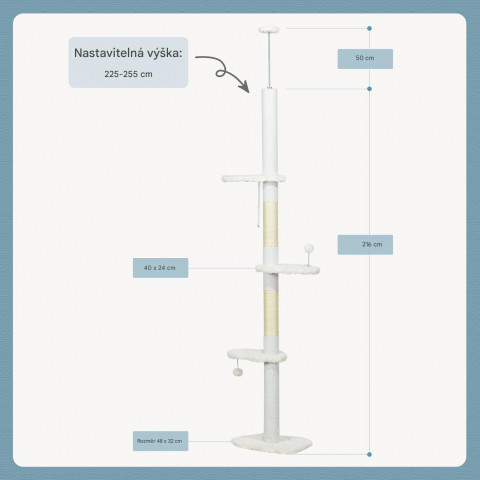 Descoperiți acest stâlp de zgâriat - un centru de activități uimitor și un sanctuar în același timp! Turnul de cățărat oferă o înălțime impresionantă de 225 până la 255 cm cu o bară de tensiune robustă. Stâlpul de zgâriat robust protejează mobilierul, oferind animalului dvs. de companie ocazia perfectă de a zgâria. Datorită mai multor platforme, pisicile se pot cățăra și pot explora împrejurimile. Pentru un plus de siguranță, scărpinatorul este echipat cu o protecție împotriva răsturnării.