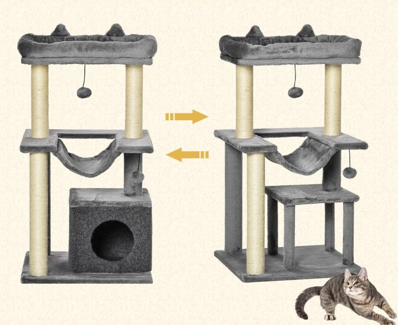 Acest ansamblu este locul perfect pentru a elibera energia, relaxa sau pentru satisfacerea dorintei de a zgaria si a se catara. Include suprafete de ascutit ghearele, un culcus, un hamac, un pat si o jucarie interactiva pentru pisici. Este fabricat din placi aglomerate din lemn masiv si acoperit cu plus moale pentru siguranta si confort.