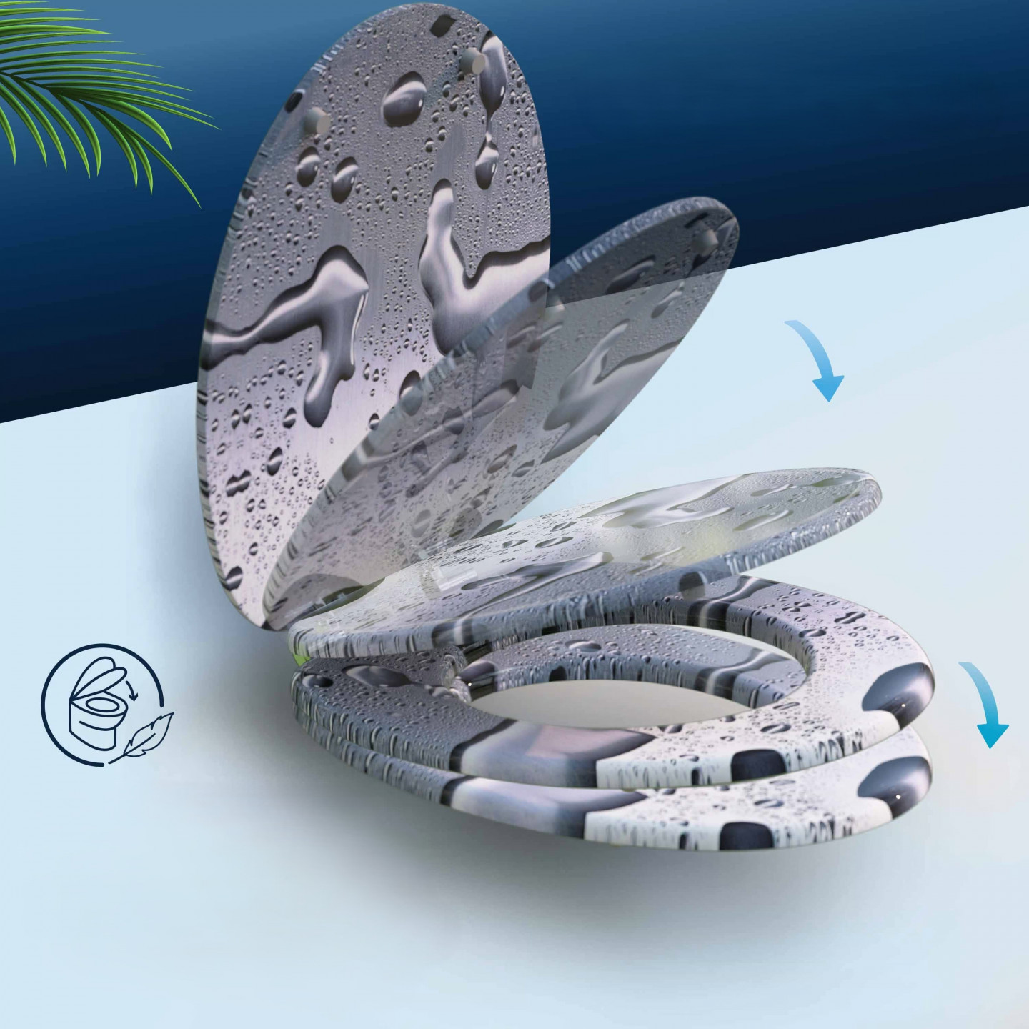 Capacul este fabricat dintr-un material rezistent și ușor de întreținut, care asigură o durată lungă de utilizare și o folosire igienică. Designul elegant cu motiv Waterdrops oferă toaletei un aspect proaspăt și modern. Dimensiunile universale permit montarea ușoară pe majoritatea vaselor de toaletă standard.