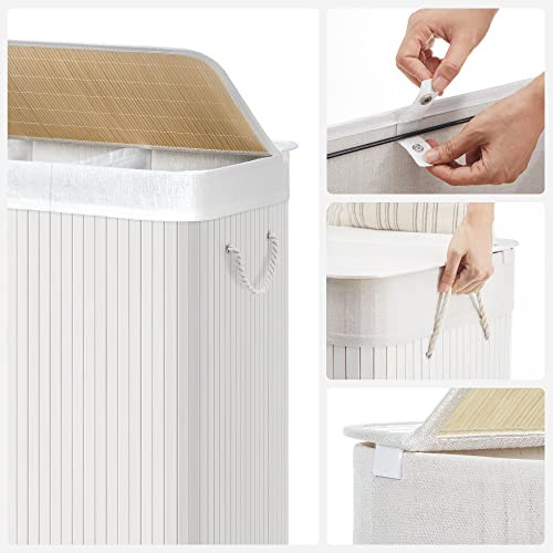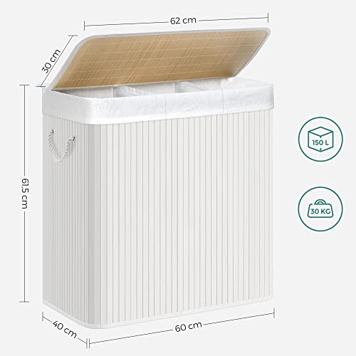 Acest cos de rufe de 60 x 40 x 61,5 cm are o capacitate mare de 150 l pentru hainele, prosoapele și lenjeria de pat. Cele 3 sectiuni vă permit să sortati hainele în functie de culoare. Lamele de bambus cu lătimea de 17 mm sunt mai durabile și mai rezistente și pot sustine o sarcină maximă de 25 kg. Atunci când nu este utilizat, pur și simplu pliati cosul de rufe pentru a economisi spațiu. Punga interioară este detașabilă, astfel încât să o puteti transporta cu ușurință la spălătorie.