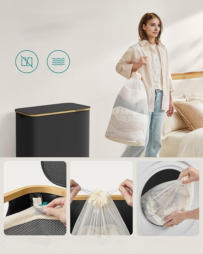 Coșul pentru rufe este prevăzut cu un capac, care nu doar că împiedică pătrunderea prafului, dar protejează și intimitatea, ascunzând dezordinea. Logo-ul din piele ecologică de pe capac servește drept mâner pentru o deschidere ușoară și adaugă o notă de eleganță.