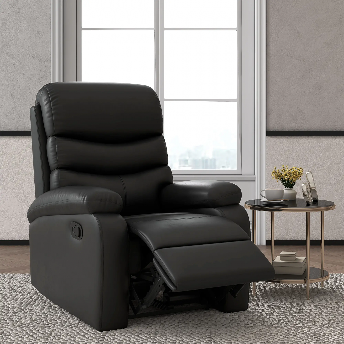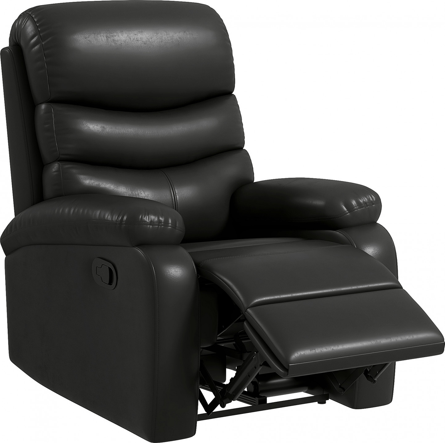 Fotoliul ideal pentru relaxare. În poziție verticală sau culcată, oferim mobila potrivită pentru toți cei care doresc să se simtă confortabil. Spătarul poate fi reclinabil la 168°, iar suportul pentru picioare integrat facilitează ridicarea picioarelor. Pielea neagră PU face din fotoliu o piesă de mobilier de înaltă calitate pentru camera de zi. Perna scaunului de 13 cm grosime oferă confortul necesar și face ca sfârșitul zilei să fie puțin mai relaxat.