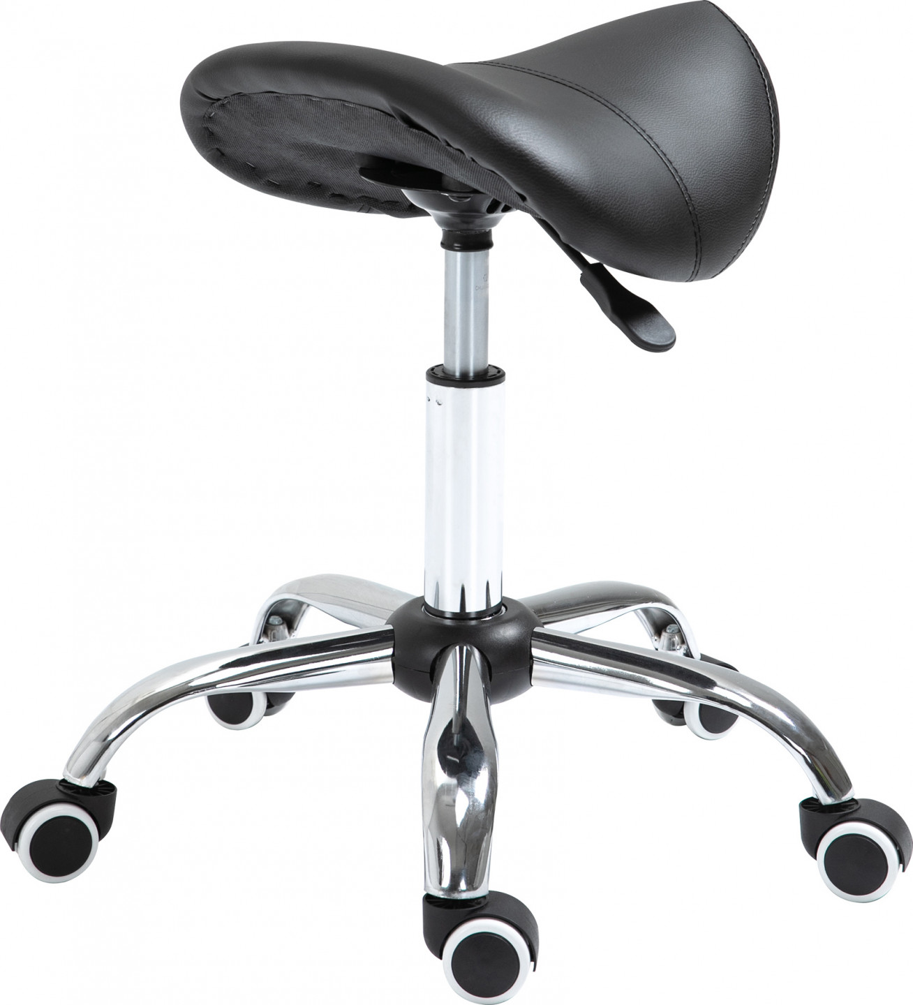 Acest scaun ergonomic în formă de șa oferă automat o poziție de ședere verticală care reduce presiunea asupra coloanei vertebrale datorită formei speciale a scaunului. Scaunul este echipat cu un arc cu gaz confortabil, este reglabil pe înălțime și poate fi rotit. Scaunul tapițat este fabricat din piele culoare naturală netedă, ușor de întreținut. Baza transversală a scaunului este echipată cu cinci rotițe robuste din nailon. Scaunul practic este ideal pentru utilizarea zilnică în casă, în orice salon de coafură, salon de înfrumusețare sau birou.