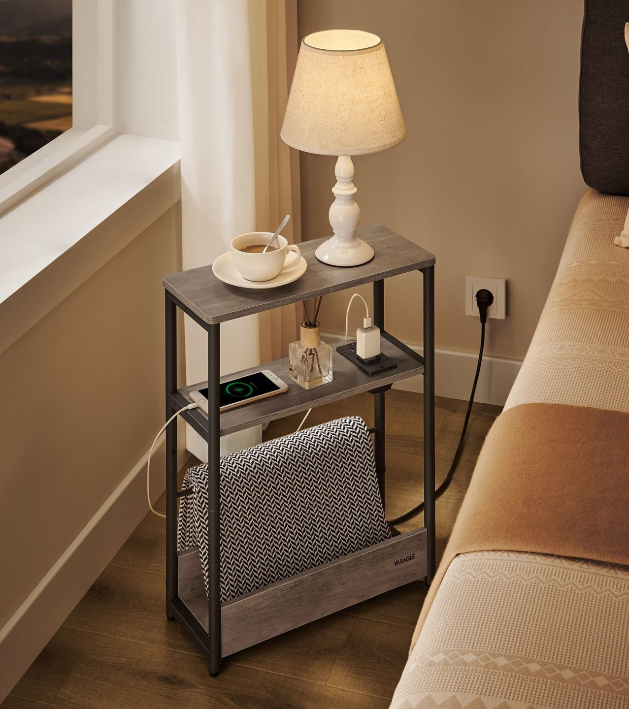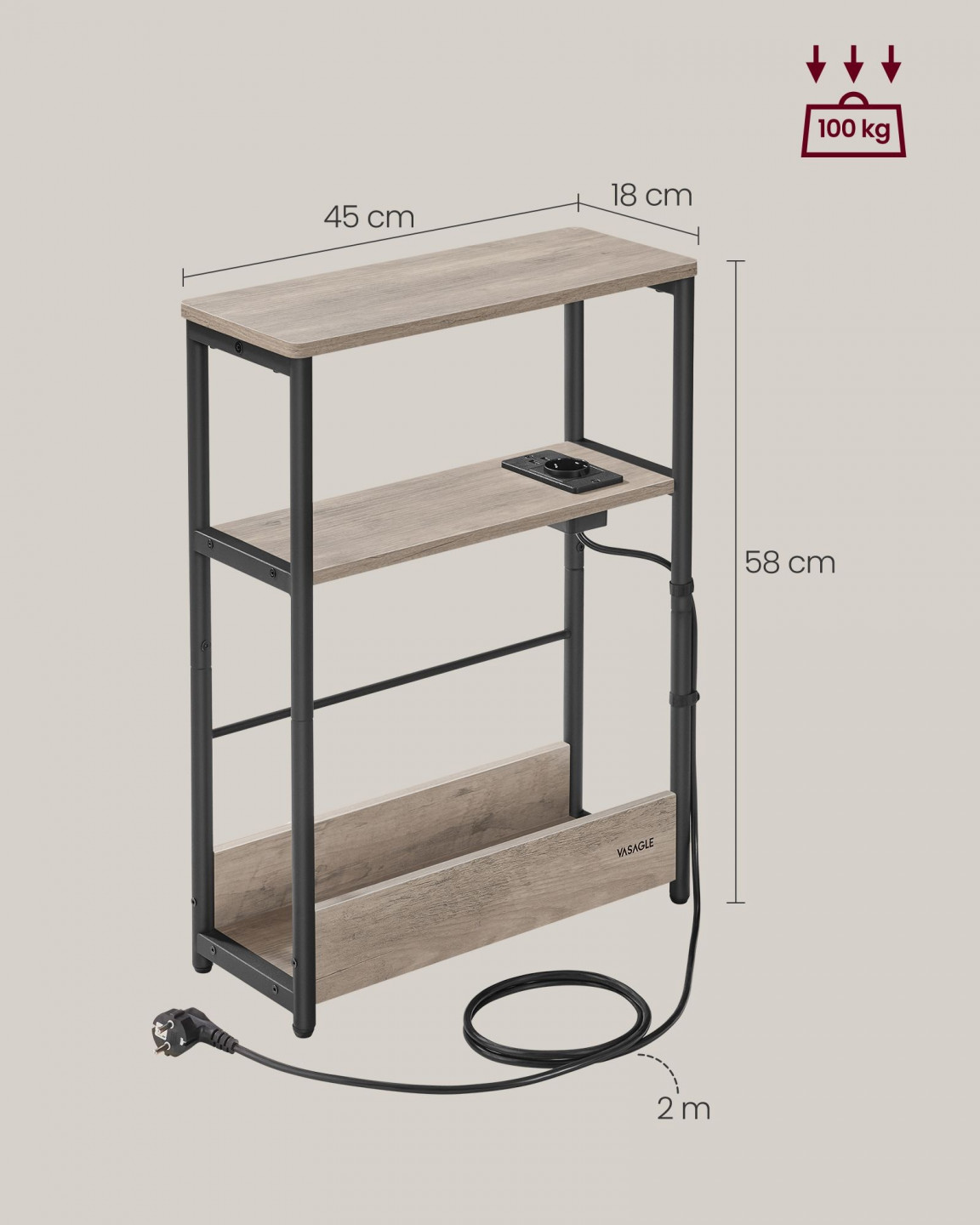 Obdélníkový stolek s policemi a zásuvkou 18 x 45 x 58 cm | šedá-černá
