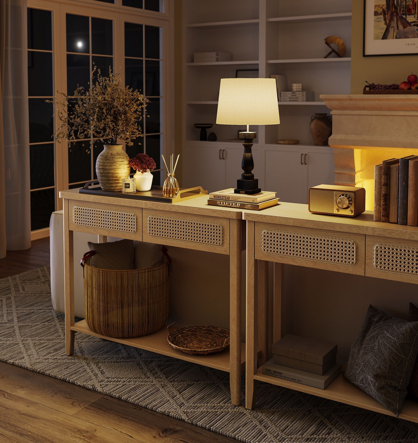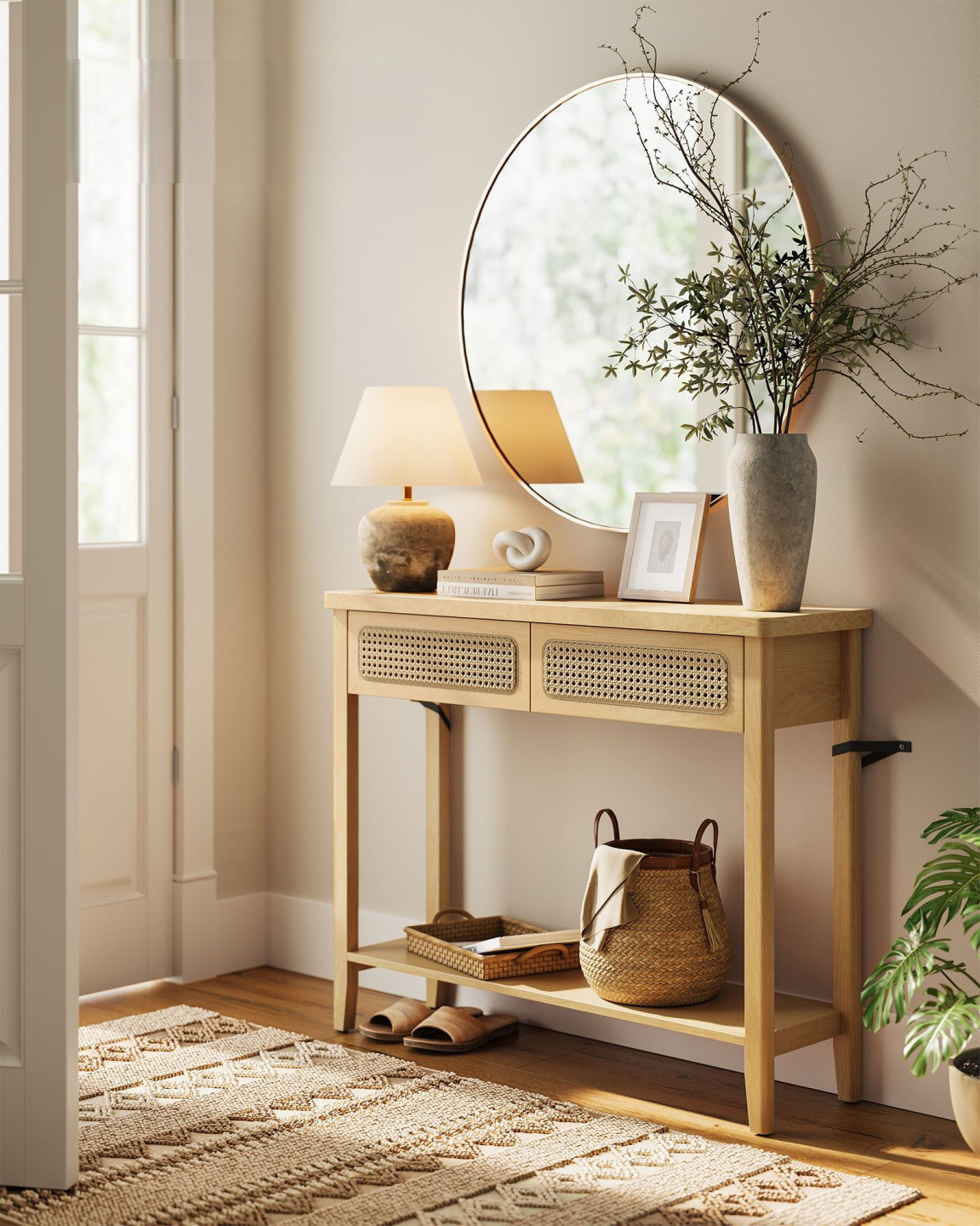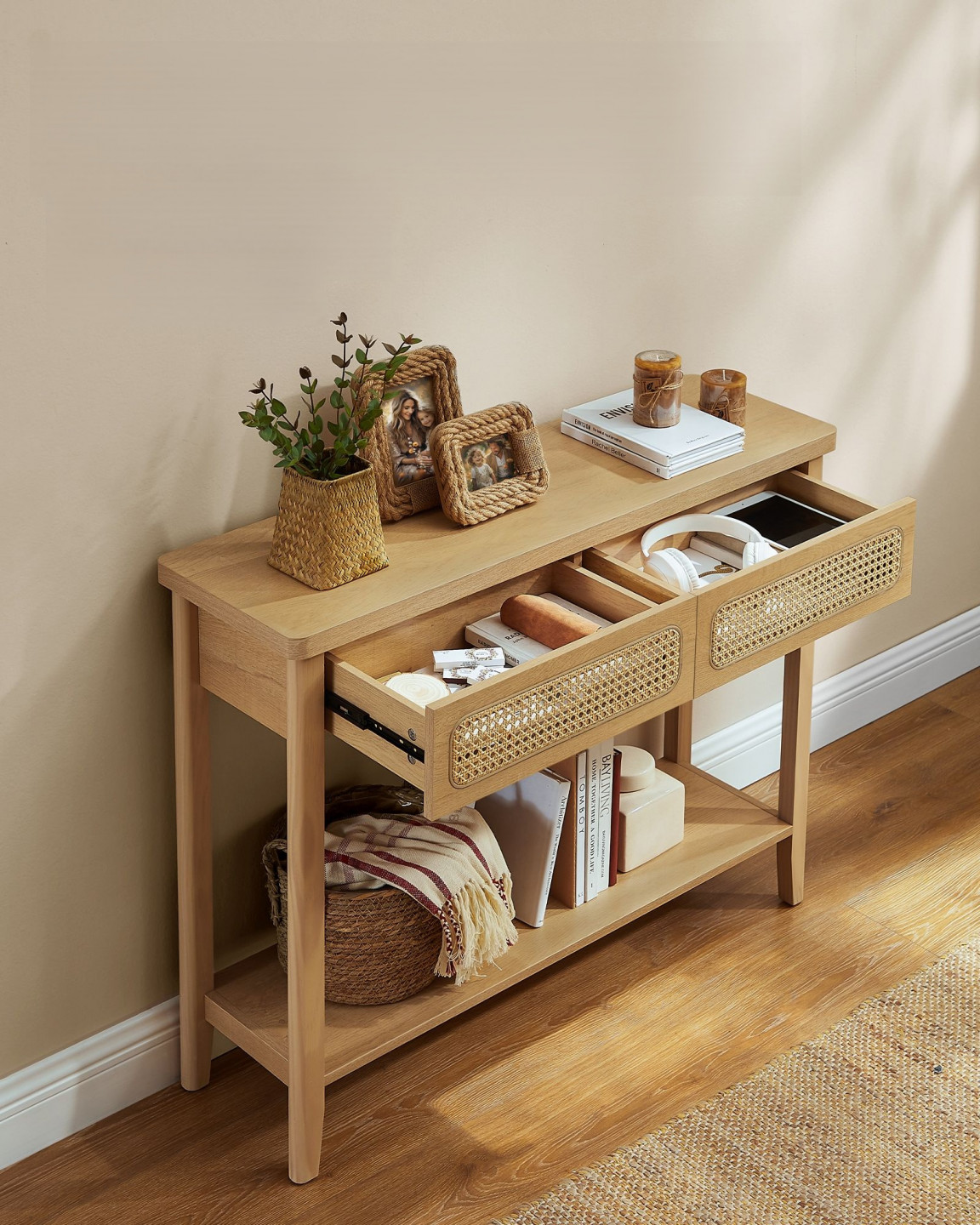 Tento konzolový stolek vyzařuje bohémskou eleganci s přírodním odstínem v zemité barvě a ratanem na přední straně zásuvky, která dodává další vrstvu textury. Je ideální pro vylepšení moderního prostoru nebo obohacení bohémského interiéru.