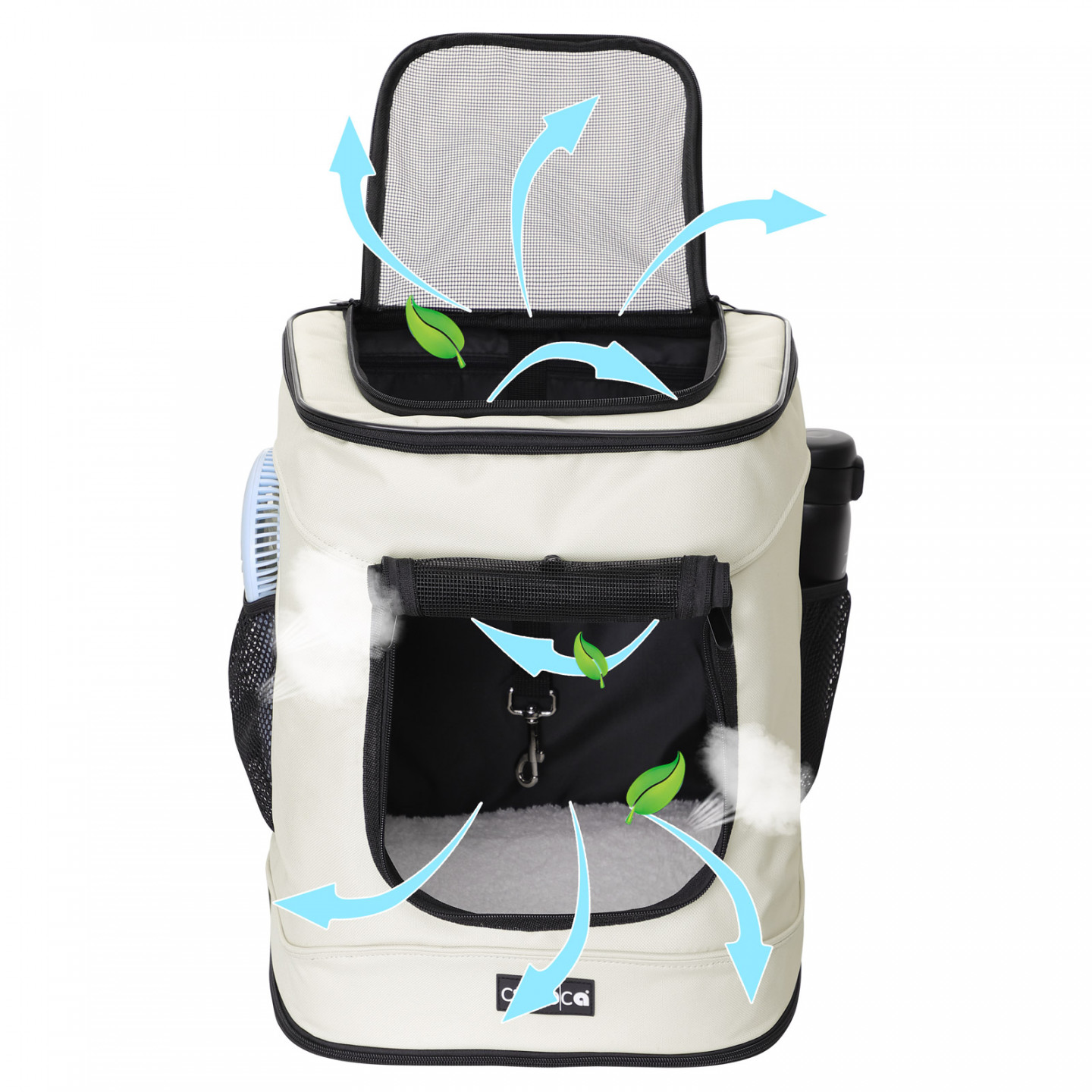 Rucsacul de călătorie pentru câini, pisici sau rozătoare este ideal pentru plimbări lungi, excursii sau drumetii. Poate fi deschis de sus și din față și are o podea solidă pentru a preveni căderea. Două buzunare laterale realizate din plasă și elastic puternic depozitează practic sticlele de băut sau alimentele. Geamurile cu plasă asigură o circulatie excelentă a aerului.