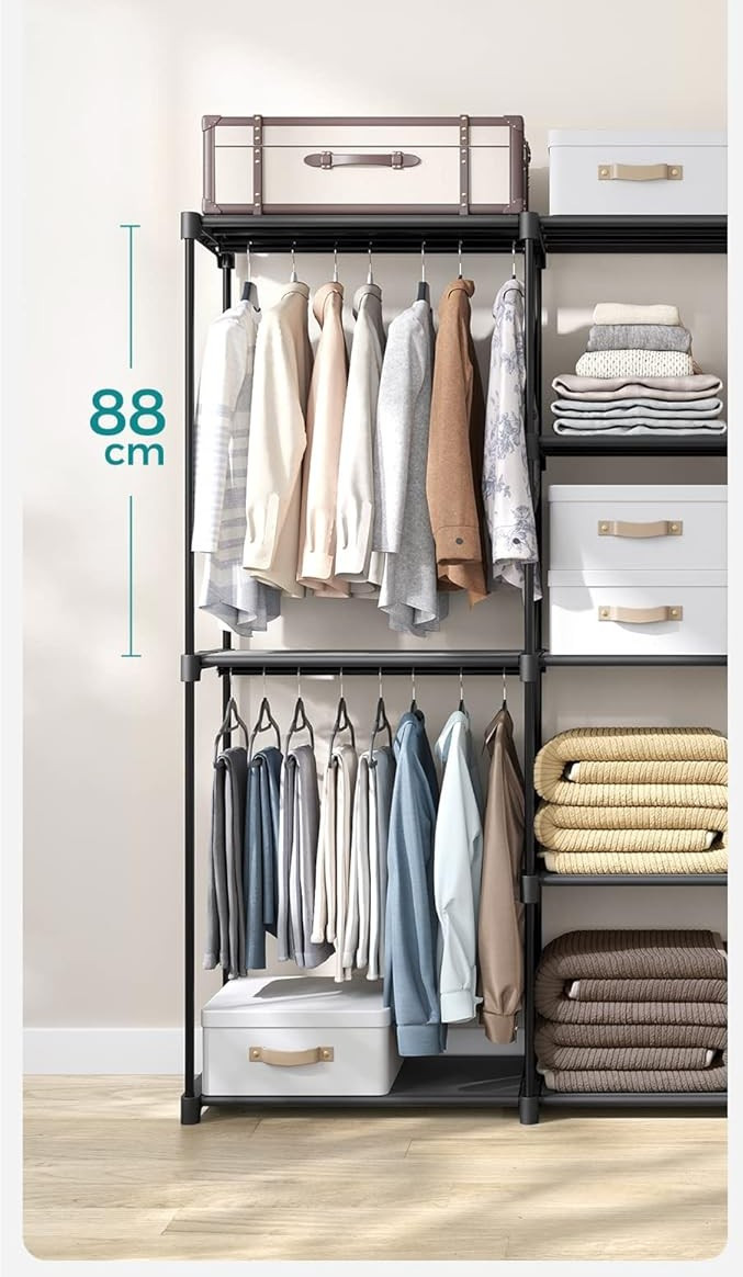 Dodejte svému interiéru pořádek i styl s tímto moderním stojacím věšákem na oblečení. Díky výšce 182 cm nabízí dostatek prostoru pro zavěšení bund, kabátů, kabelek i doplňků. Jeho stabilní konstrukce a minimalistický design v elegantní černé barvě se hodí do předsíně, kanceláře, čekárny i šatny.