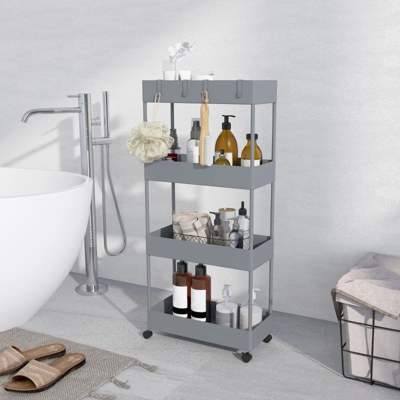 Tento pojízdný vozík je ideální pro malé prostory, které potřebují více úložného prostoru. Díky čtyřem policím a čtyřem odnímatelným hákům nabízí dostatek prostoru pro kuchyňské náčiní a potraviny. Díky hladce se otáčejícím kolečkům jej lze snadno přemístit na jakékoli požadované místo. Je ideální jako kuchyňský stůl, servírovací vozík a pro mnoho dalších použití.