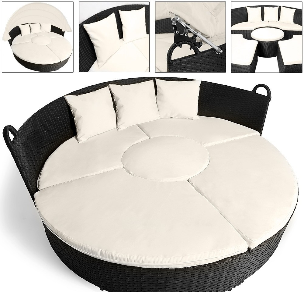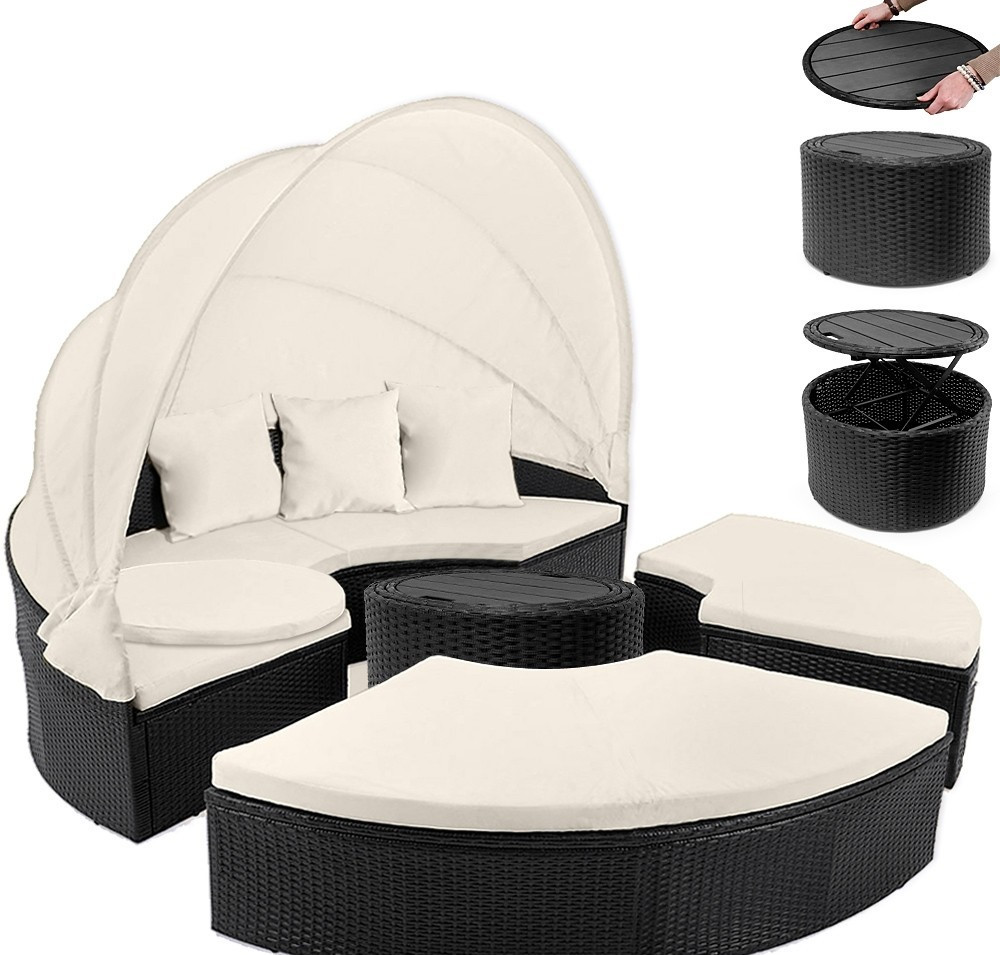 Mobilier de gradina din ratan, datorita designului sau bine gandit va indeplini mai multe functii. Extinzând canapeaua rotundă din ratan, obținem într-o clipă o canapea practică din ratan, acoperită cu două locuri, cu spătar, două scaune separate din ratan și o masă rotundă telescopică. Balachinul reglabil asigura umbra si protejeaza de vant. Acest sezlong de grădină este o soluție ideală pentru relaxare sau pentru momentele plăcute petrecute alături de prieteni. Potrivit pentru grădină, terasă, piscină sau plajă. Întreținerea ușoară și viața lungă a materialelor utilizate vor satisface nevoile facilităților publice, cum ar fi hoteluri, centre de wellness, spa, etc… apod.