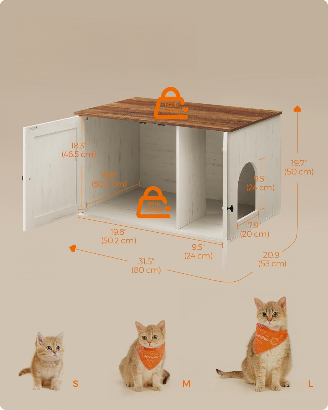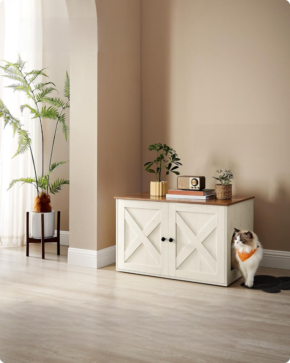 Díky svému rustikálnímu stylu a elegantním dvířkům od stodoly se tento zásobník pro kočky snadno hodí kamkoliv. Díky uzavřené konstrukci poskytuje soukromé místo, kde se vaše kočka cítí bezpečně a vytváří méně nepořádku.
