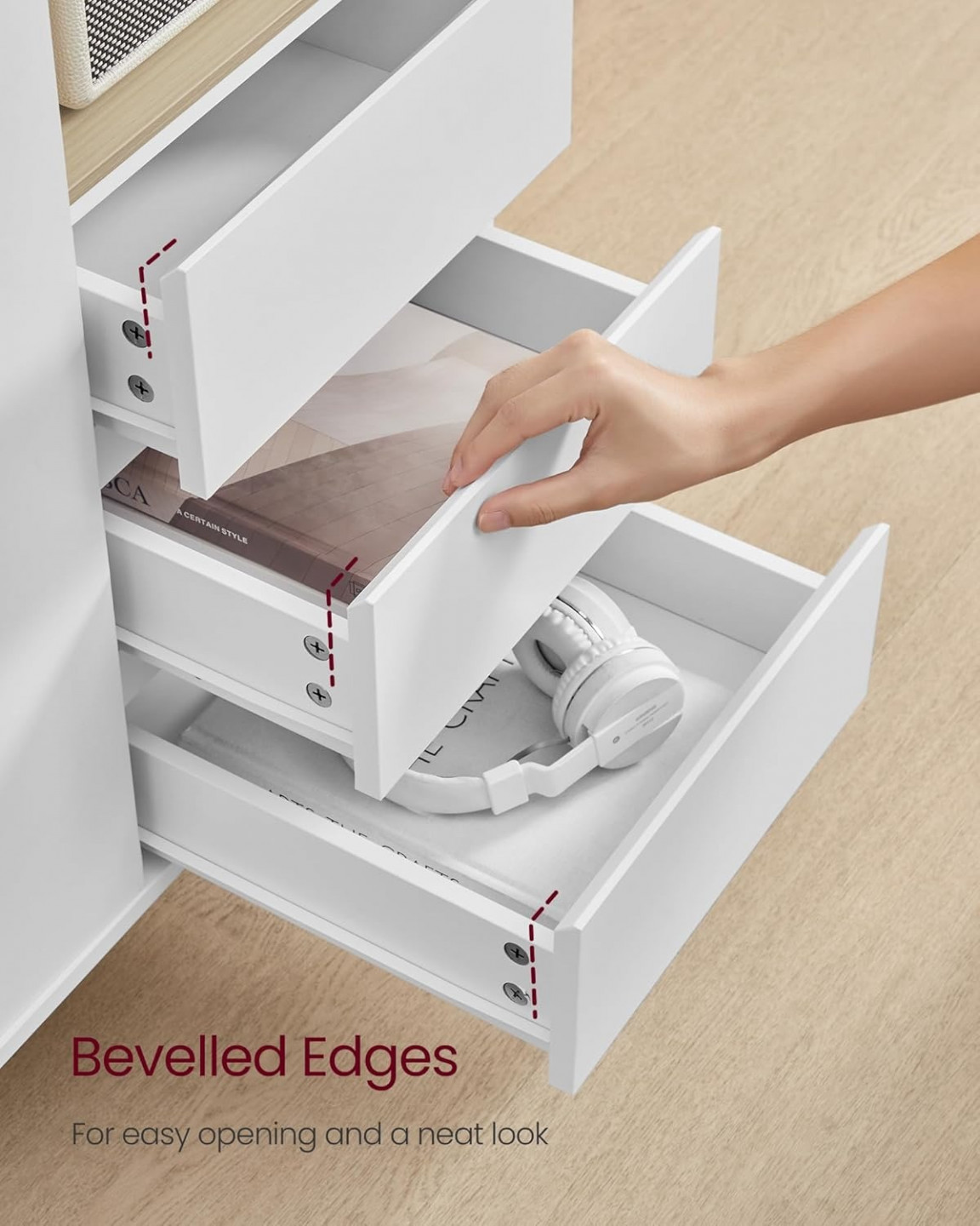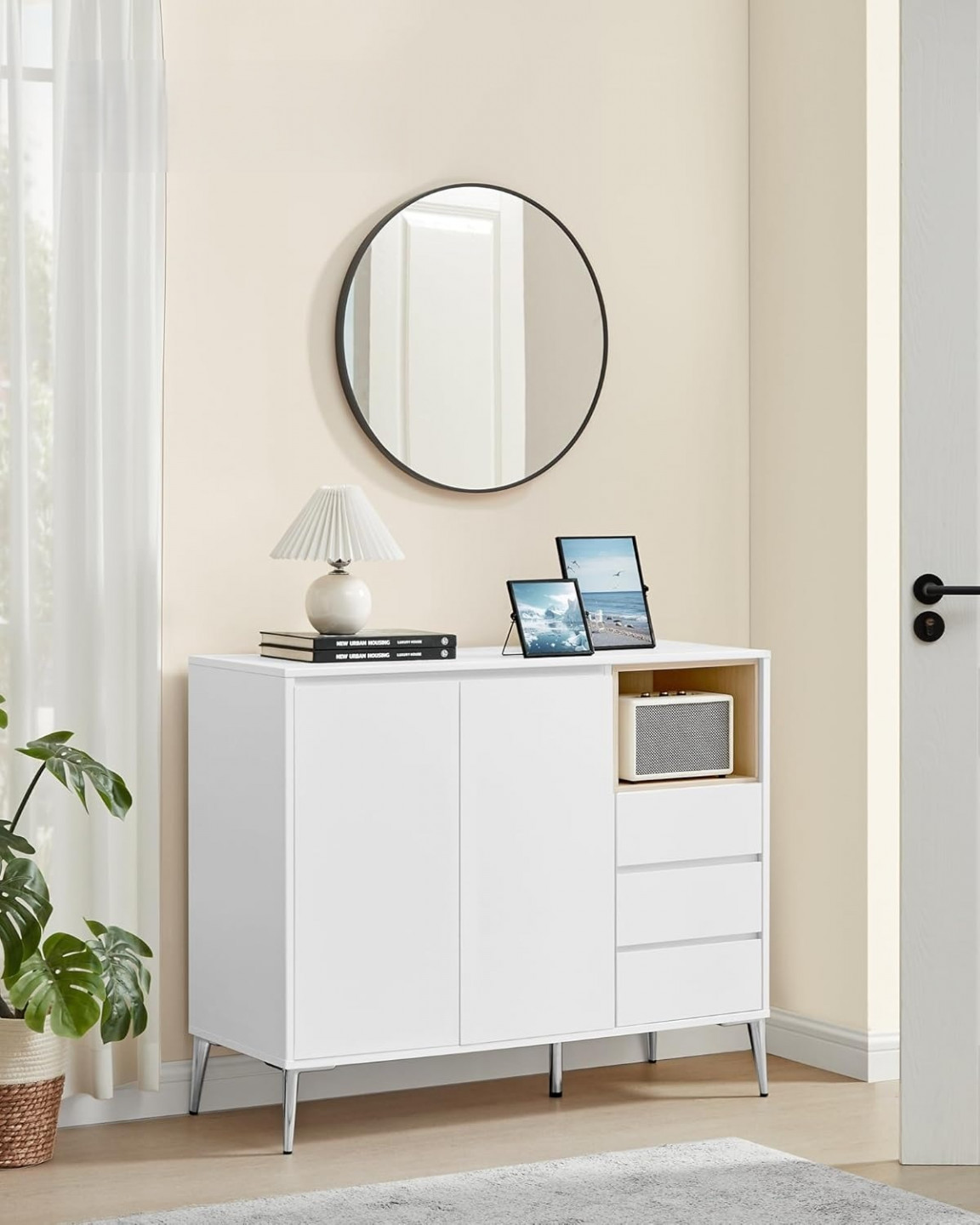 Elegantní linie a čistá bílá barva dodávají této úložné skříňce minimalistický, moderní vzhled, který se bez problémů hodí do různých stylů a místností, včetně obývacího pokoje, chodby, jídelny nebo pracovny.