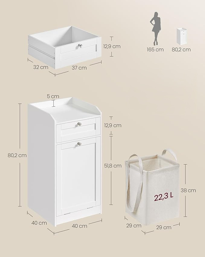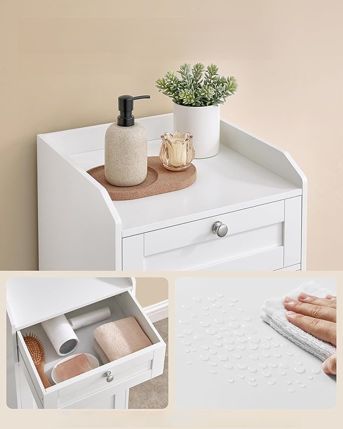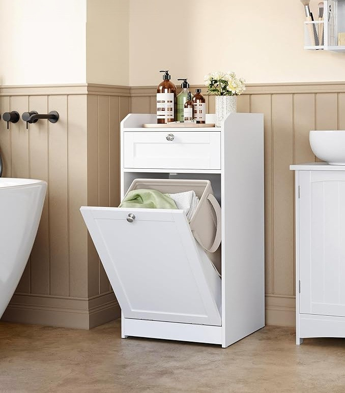 Pe lângă raftul superior și sertarul care oferă acces facil la lucrurile dumneavoastră, acest dulap de baie include și un coș pentru rufe, care vă va satisface nevoile de depozitare a lenjeriei.