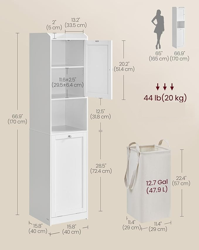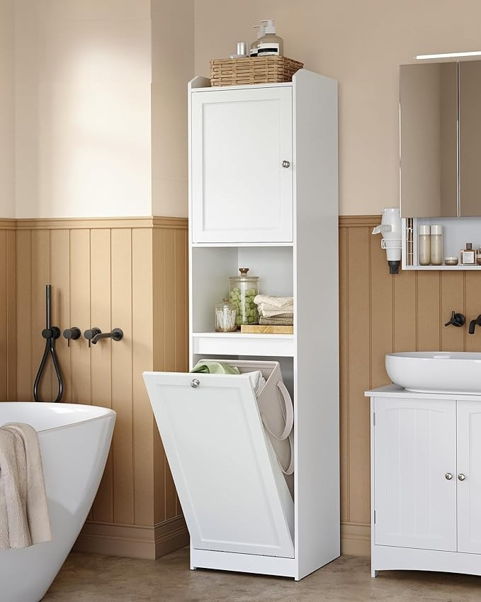 Tato vysoká koupelnová skříňka splňuje všechny vaše potřeby díky horní polici se zvýšenými okraji, které zabraňují pádu předmětů, uzavřené přihrádce na soukromé věci, otevřené polici na často používané předměty a koši na prádlo.
