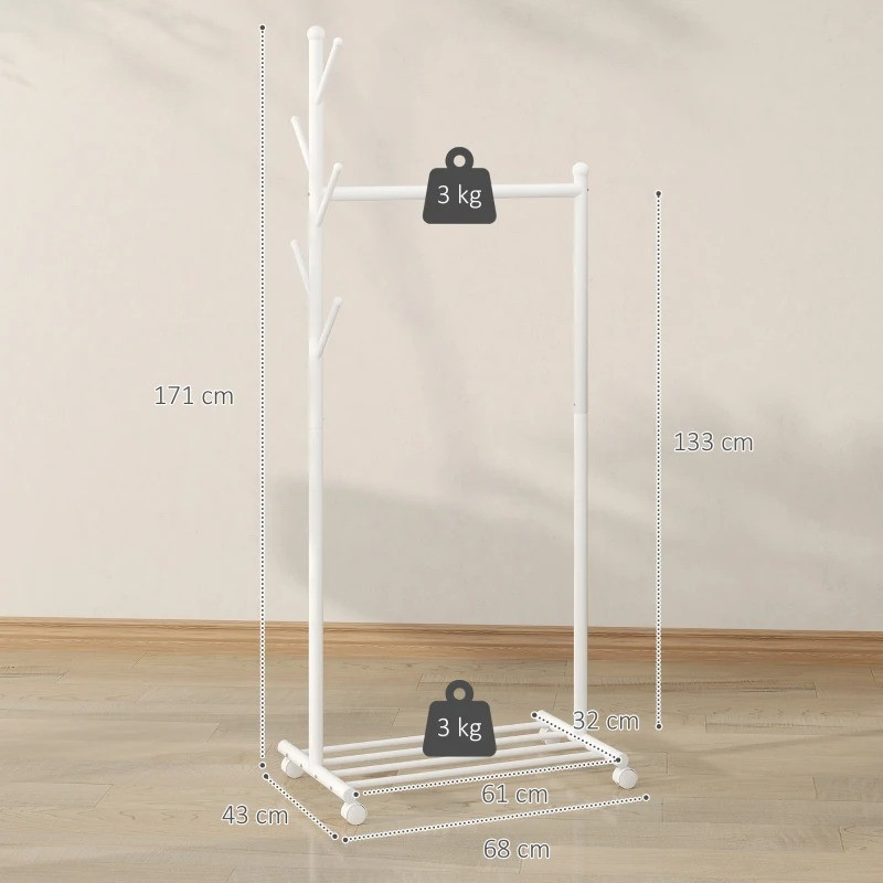 Vă confruntați cu un dormitor dezorganizat și dimineți aglomerate? Atunci când hainele se adună în grămezi, iar alegerea ținutei devine o căutare continuă, spațiul dumneavoastră se transformă într-o sursă de stres. Acest cuier pentru haine aduce o soluție practică în rutina zilnică: oferă suficient spațiu pentru garderobă, iar datorită suportului integrat și cârligelor, încălțămintea și gențile rămân organizate, pentru a începe ziua într-un mod ordonat și confortabil.