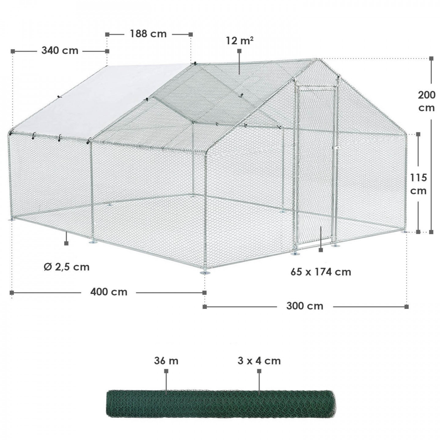 - Dimensiunile generale ale volierei: 300 x 400 x 200 cm (LxPxA), 385 cm (lungime exactă)