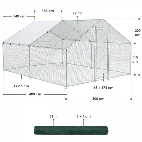 Țarc, incintă de exterior HLS25T cu dimensiuni de 3 x 4 x 2 m este ideală pentru păstrarea animalelor în aer liber. În țarcul galvanizat pentru găini, iepuri și gâște, animalele mici au suficient spațiu în aer liber pe 12 m². Pânza impermeabilă poate fi atașată flexibil la cadru. Țevile galvanizate și gardul acoperit cu PVC vă oferă un coteț stabil și durabil pe care îl puteți construi cu ușurință cu un sistem plug-and-click.