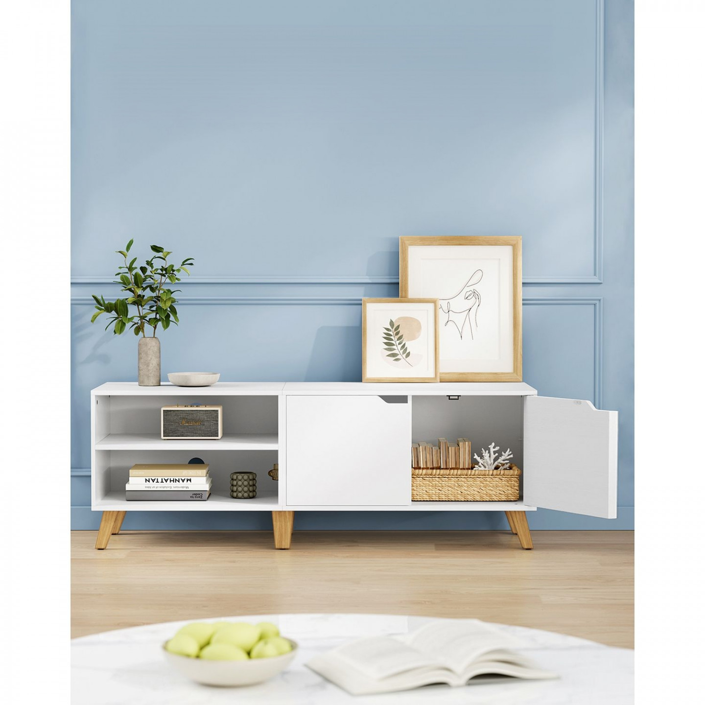 Moderní televizní stůl se vyznačuje jednoduchým designem a stabilním zpracováním. Poskytuje dostatek prostoru pro váš televizor a technické vybavení. Tento stojan pojme televizory s úhlopříčkou až 60 palců. Umístěte své konzole a krabice do 2 otevřených polic a uložte svá DVD za dveřmi.