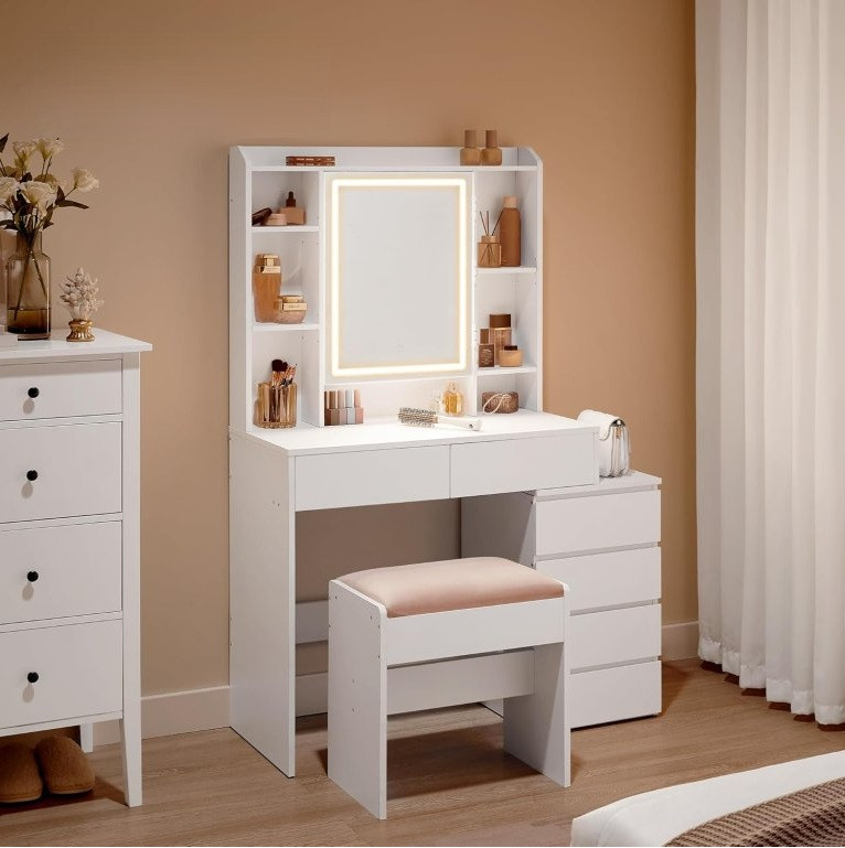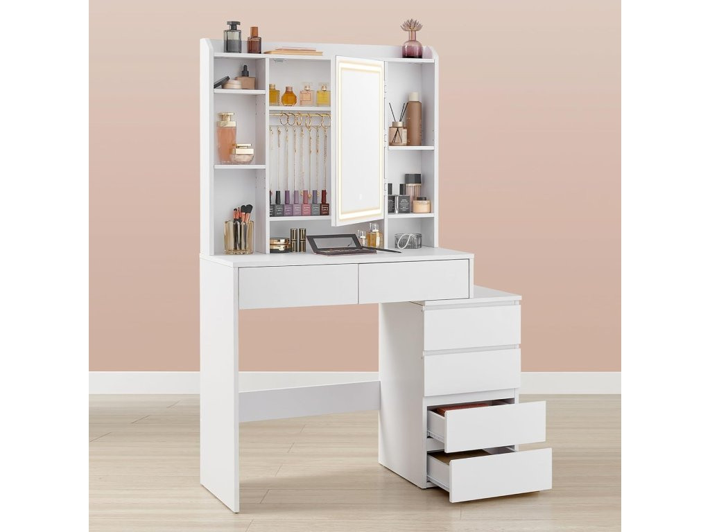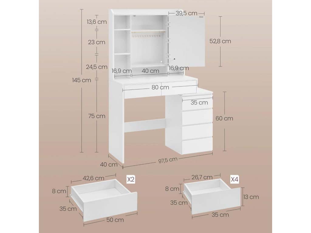 Tento kosmetický stolek je vyroben z kvalitní dřevotřísky, je stabilní a odolný. Jeho povrch je odolný proti opotřebení a snadno se čistí, takže vás bude doprovázet po mnoho let.