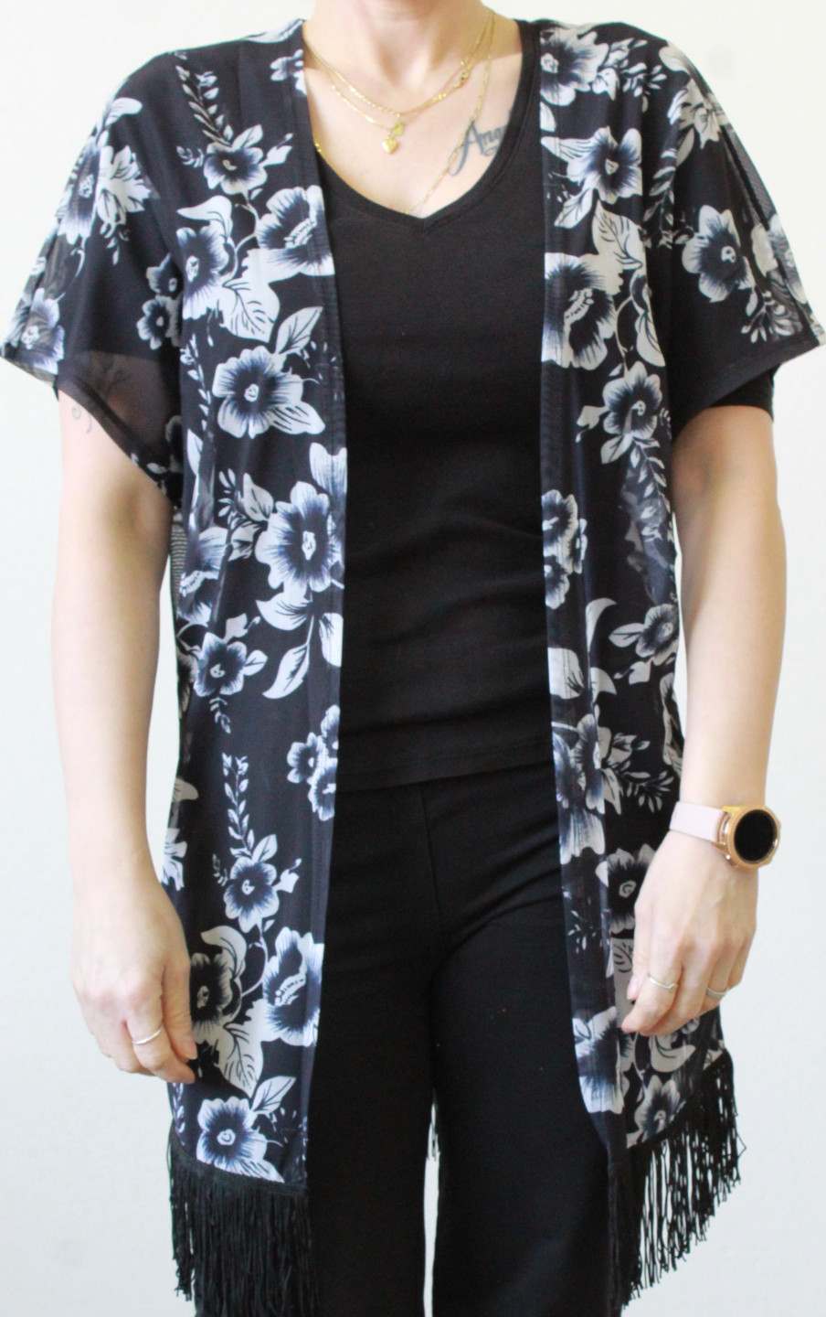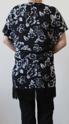 Tunica neagră cu flori albe se potrivește peste un costum de baie și are franjuri la capăt.