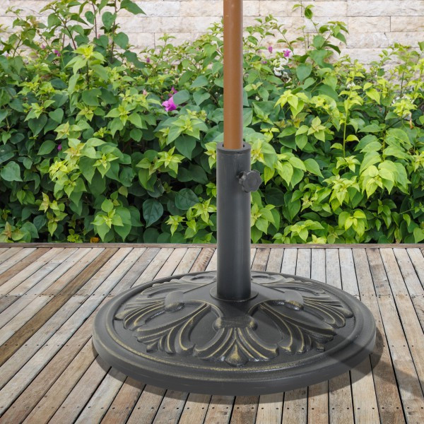 Acest suport din otel este potrivit pentru umbrelele cu tija de diametru 35 - 48 cm. Suportul este suficient de puternic pentru a-ți ține umbrela chiar și pe vreme de vânt. Construcția sa robustă asigură stabilitate optimă pentru utilizarea pe termen lung. Un singur șurub este utilizat pentru fixarea umbrelei.
